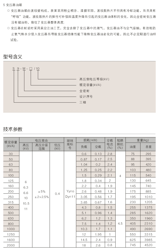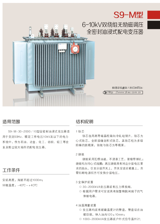 S9- M- 30~2000/ 10型全密封油浸式變壓器適.用于交流50Hz、額定工作電壓10kV及以下的電力系統(tǒng)中,作為石油、冶金、化工、紡織、輕工等企業(yè)及粉塵較大場(chǎng)所的配電變壓器。