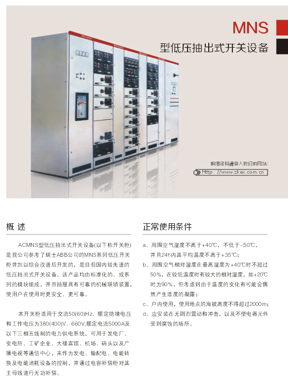 ACMNS型低壓抽出式開關設備(以下稱開關柜) 是我公司參考了瑞士ABB公司的MNS系列低壓開關 柜并加以綜合改進后開發的,是目前國內較新型的 低壓抽出式開關設備。該產品均由標準化的、成系 列的模塊組成,并且抽屜具有可靠的機械聯鎖裝置, 使用戶在使用時更安全、更可靠。